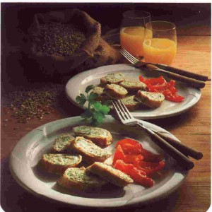 | Rozpočet pro 6 osob: 200 g jemného žitného šrotu 1/4 l mléka 50 g sezamového semínka 4 vejce, 1/2 lžičky soli 3 lžíce oleje Na bylinkový sýr 2 stroužky česneku 125 g změklého másla 250 g nízkotučného tvarohu 8 lžic sekané petrželky 1 střik sojové omáčky 1 lžíce kořeněného sezamového oleje |