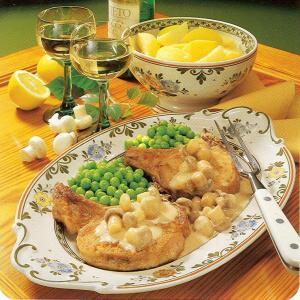 Vhodná příloha: 50 g kostiček cibule poduste na 40 g másla. Přidejte 600 g hrášku, trochu cukru a doduste přikryté, smíchejte se sekanou petrželkou. Vařené brambory. Suché bílé víno. |
