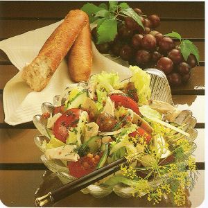 dejte do mísy, osolte, opepřete. Navrstvěte cibuli, hroznové víno, nahoru dejte