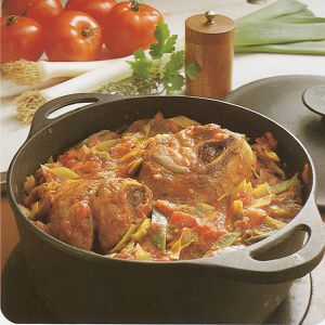 Toto jídlo můžete připravit snadno pro více osob a dusit v troubě. Pro každé 2 osoby potřebujete 4 cm tlusté plátky jehněčí kýty, která s kostí váží okolo 400 g. Větší množství duste déle. |